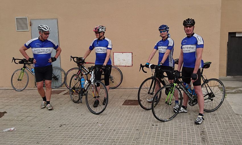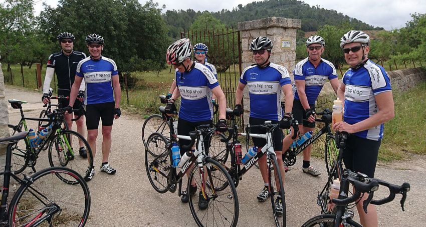 Wir rollten also in Richtung Bunyola los. Kurz vor dem Einstieg zum Col hatte der Käpt'n in den letzten Jahren immer seinen berühmten Pinkeltrick gebracht. So hoffte er auch diesmal durch den Pinkel-Stop der Jungs mit den Konfirmandenblasen den entscheidenen Vorsprung für den Sieg zu bekommen. Er rollte nämlich dann immer mit dem Zufahrer flott davon. Diesmal erwischte es ihn aber auch. Wahrscheinlich hatte er beim Frühstück einen Kaffee zuviel konsumiert. Als er dann nach einer Express-Entleerung mit dem Zufahrer anrollte, kam im das Glück zur Hilfe. Beim Anfahren merkte ich, dass mein Hinterreifen Luftmangel hatte. Ich musste also flicken. Bis wir dann los kamen, war er über alle Berge.
