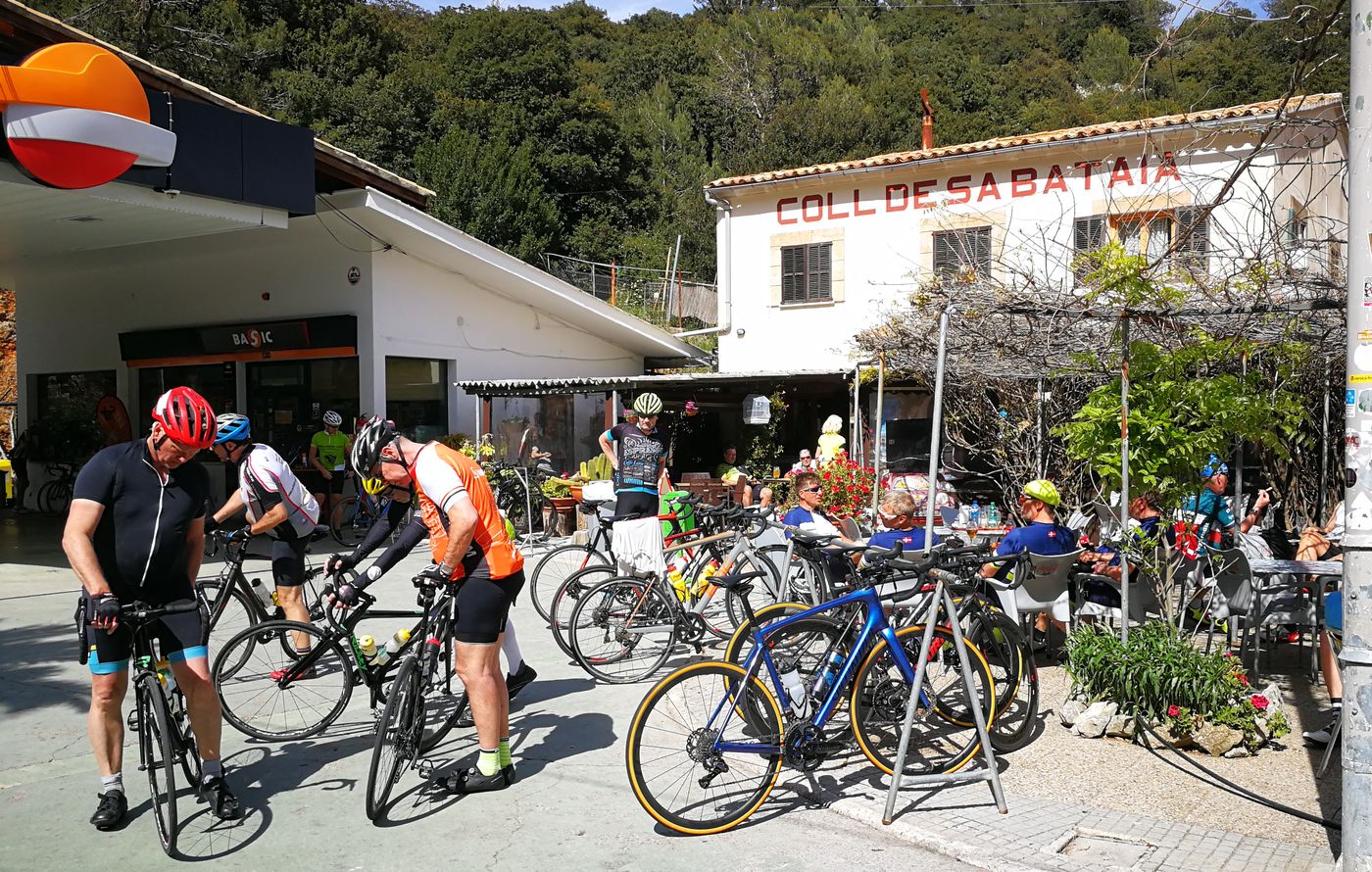 Thomas, Mathias und Martin sparten sich die Kosten für das Schiff und kamen über den Puig. Sie fuhren uns entgegen und erwarteten uns am Krawattenknoten. Am Kiosk am Ende der Sa Calobra Straße haben wir uns kurz gestärkt. Das war bitter nötig, weil die Pause in Soller unter den Tisch gefallen war. Eine längere Rast machten wir traditionell an der Tankstelle/Col de sa Bataia. Hier gibt es alles was das Radlerherz begehrt zu immer noch vernünftigen Preisen.
