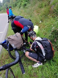 Auch an diesem Tag sollten wir wieder über 1000 hm sammeln. Kurz nach dem Start kamen dann die ersten Probleme. Auf der von Heinz-Werner geplanten Route befand sich eine Baustelle, die nicht zu passieren war. Also mussten wir ein Stück zurückfahren und eine weitere Umleitung nehmen. Auf der mussten wir einige Mal nach Diskussion und Befragung der Locals die Route anpassen. Dann kam an einer ungünstigen Stelle mit viel LKW-Verkehr auch noch ein Kettenklemmer am Rad von Bernhard hinzu. Es lief also nicht ganz rund. Den Klemmer konnten wir zum Glück ohne Demontage von Teilen an einer ruhigen Stelle beseitigen.