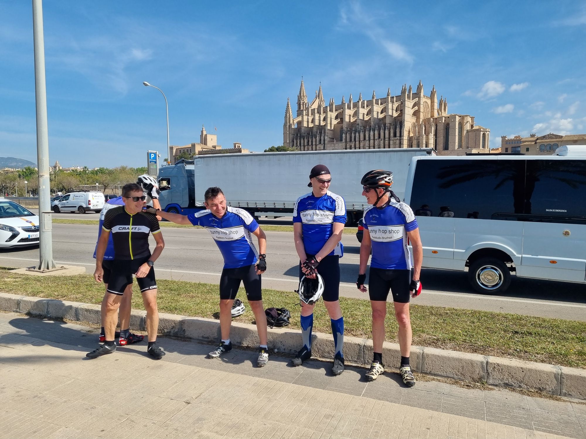 Auf unserer 3. Tour wollten wir den Sohn von Bernes treffen, der Sa Coma war. Also starteten wir an der Playa in Richtung Palma / Antratx. Der Radweg war wie immer eine reine Nervensache. Wenn du da nicht hellwach bist rumpelt es. Aber wieder sind wir ohne Unfall bis Palma gekommen. Vor der historischen Kulisse der Kathedrale musste natürlich das obligatorische Gruppenbild her. Dank netter Fotografin klappte das auch reibungslos.