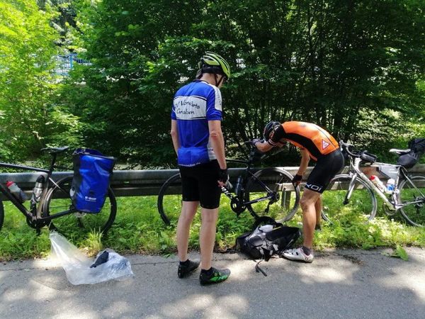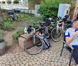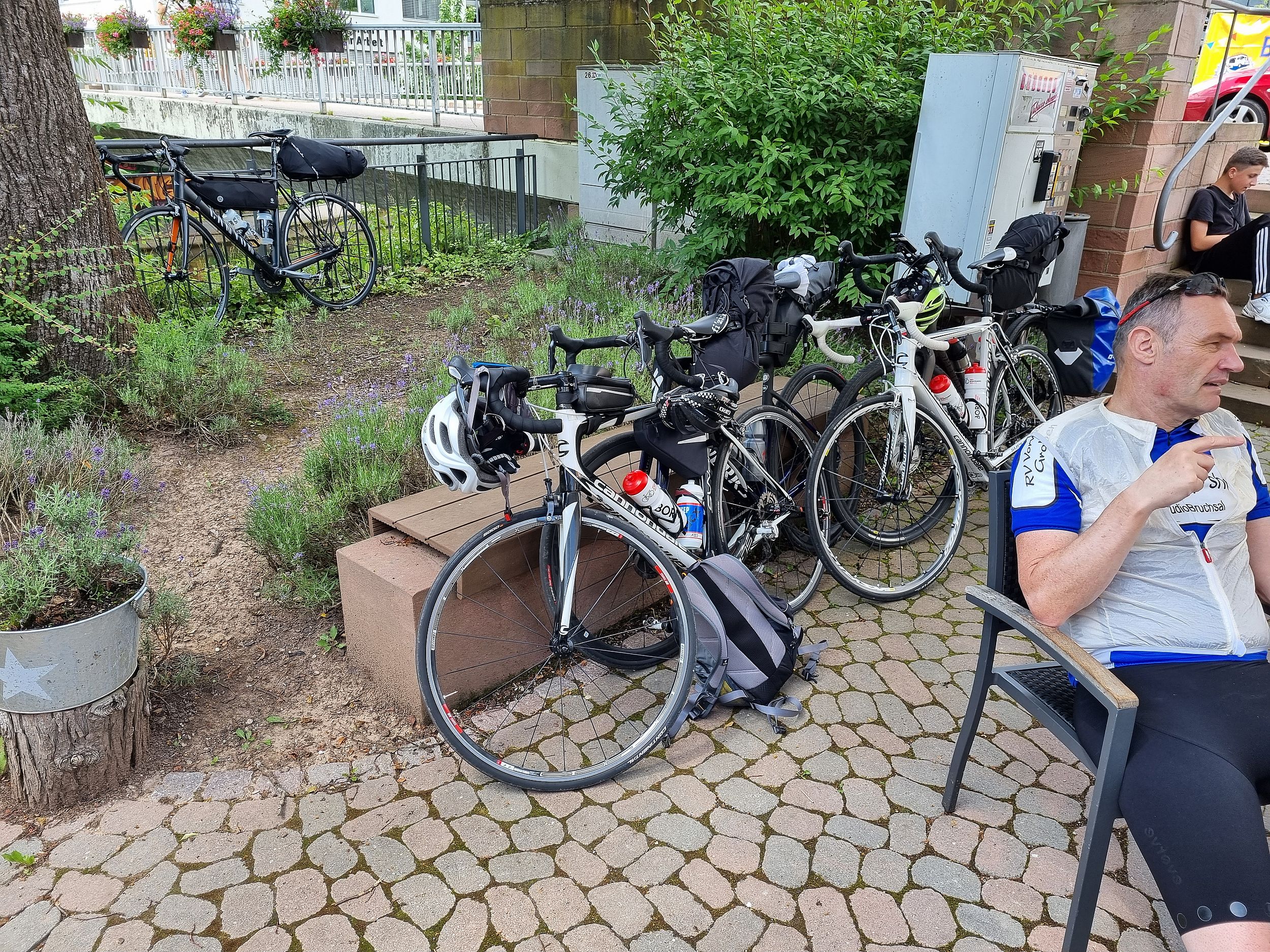 Vor dem Trip hatte ich meine tubeless Reifenkonfiguration in den höchsten Tönen angepriesen. Geringer Rollwiderstand und Pannensicherheit waren die Schlagwörter. Nach Calw kam dann die erste Ernüchterung. Am fast neuen Hinterreifen tat sich ein Loch auf und spritze mir den Rahmen, Beine und Arschrakete mit Dichtmilch voll. Die Dichtmilch schaffte es auch nicht, das Loch wieder zu schliessen. Eine Pannenflüssigkeit von Bernhard sorgte auch nur für temporäre Verbesserung. Mit einigem Nachpumpen schaffte ich es mit versifftem Rad dann doch bis Nagold. Hier habe ich am nächsten Morgen einen Schlauch eingezogen.