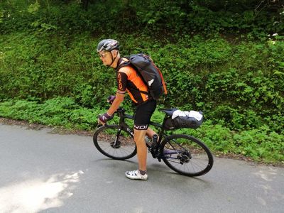 Ich hatte schon eine wasserdichte Arschrakete, die aber in der Kapazität sehr begrenzt war. Darum legte ich mir von Ortlieb noch einen wasserdichten Bikepacker-Rucksack zu. So hatte ich wohl das höchste Gewicht auf dem Rücken.