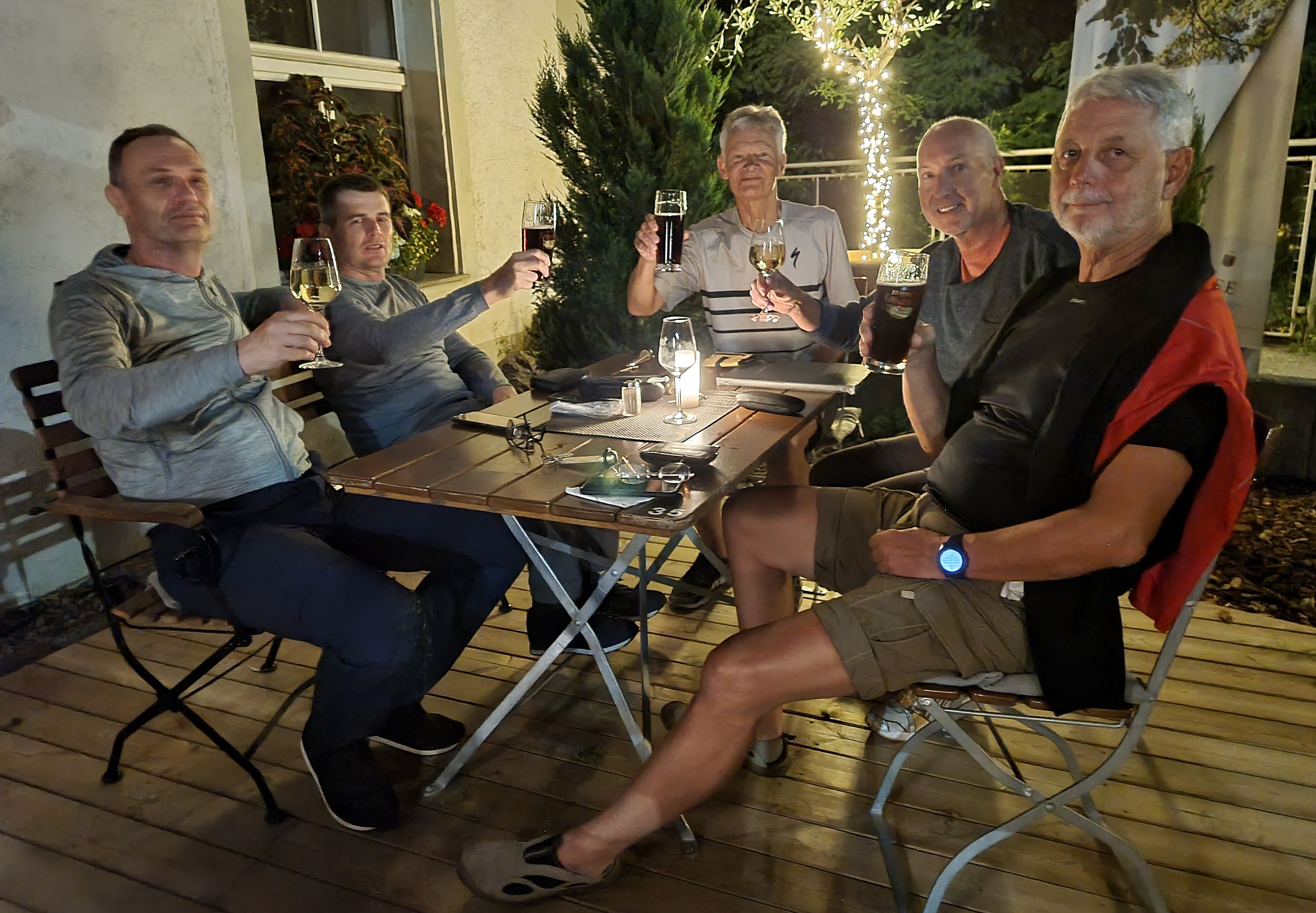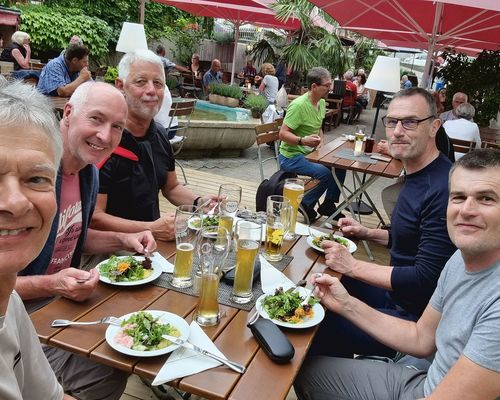 Und abends machten wir es uns im schönen Biergarten gemütlich. Im Laufe des Abends fanden unsere Weinexperten auch Gelegenheit, den Unterschied Müller-Thurgau und Grauem Burgunder zu diskutieren.