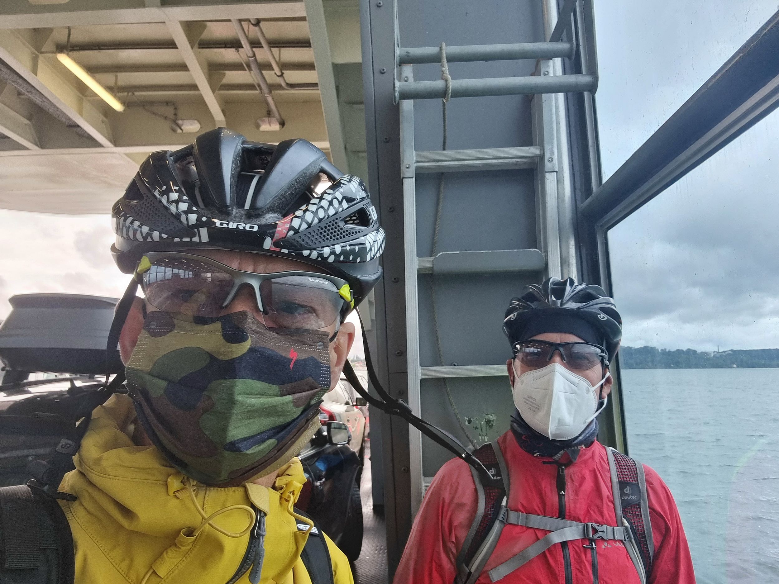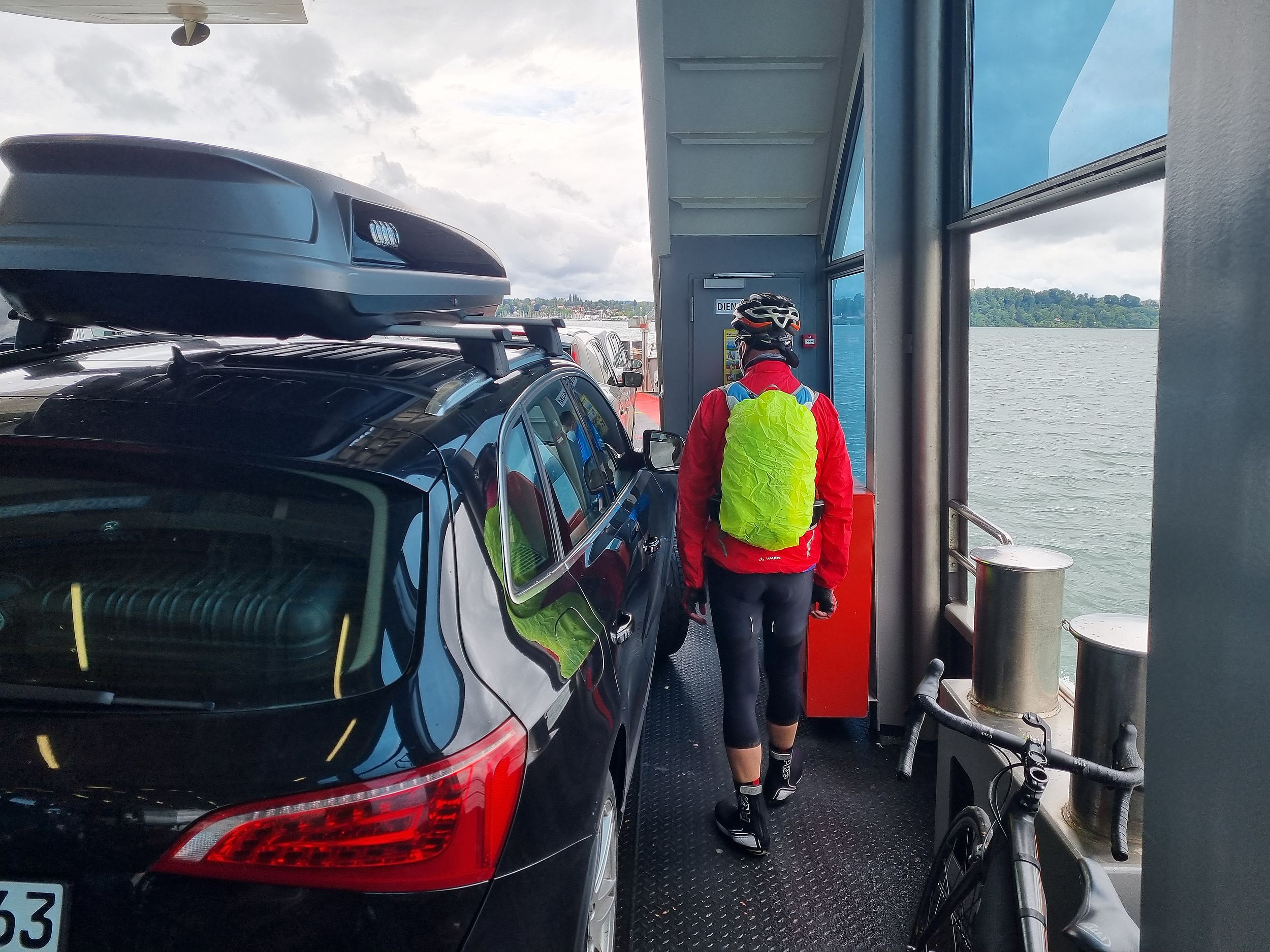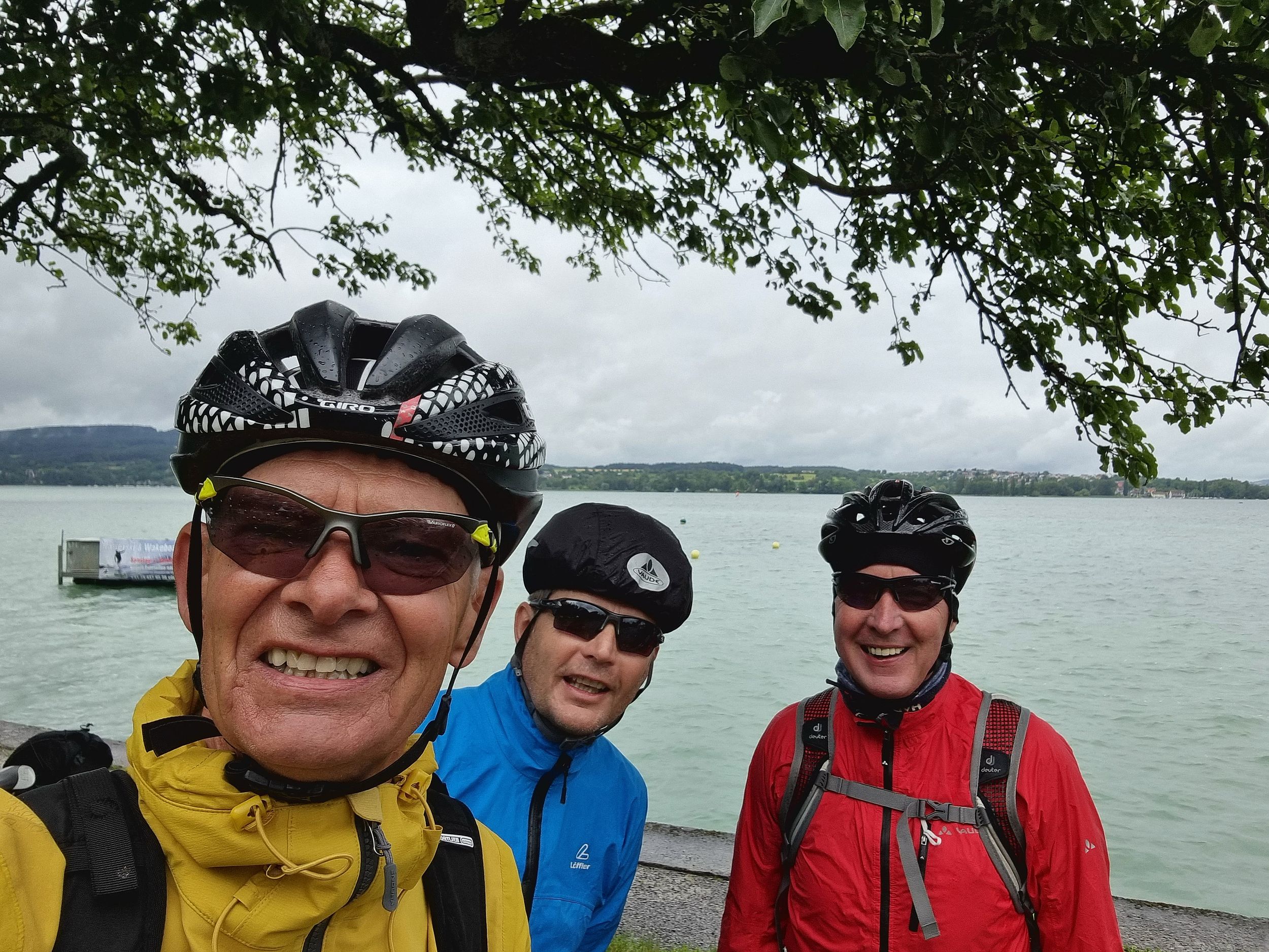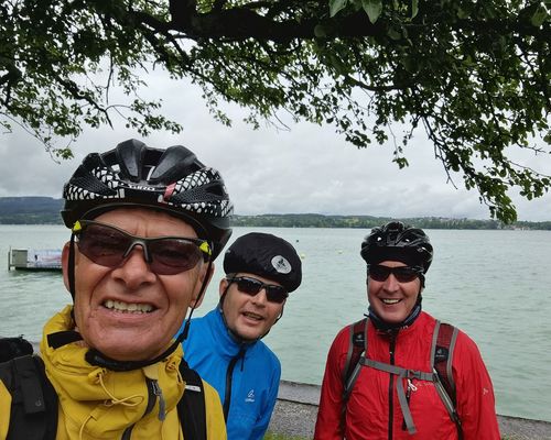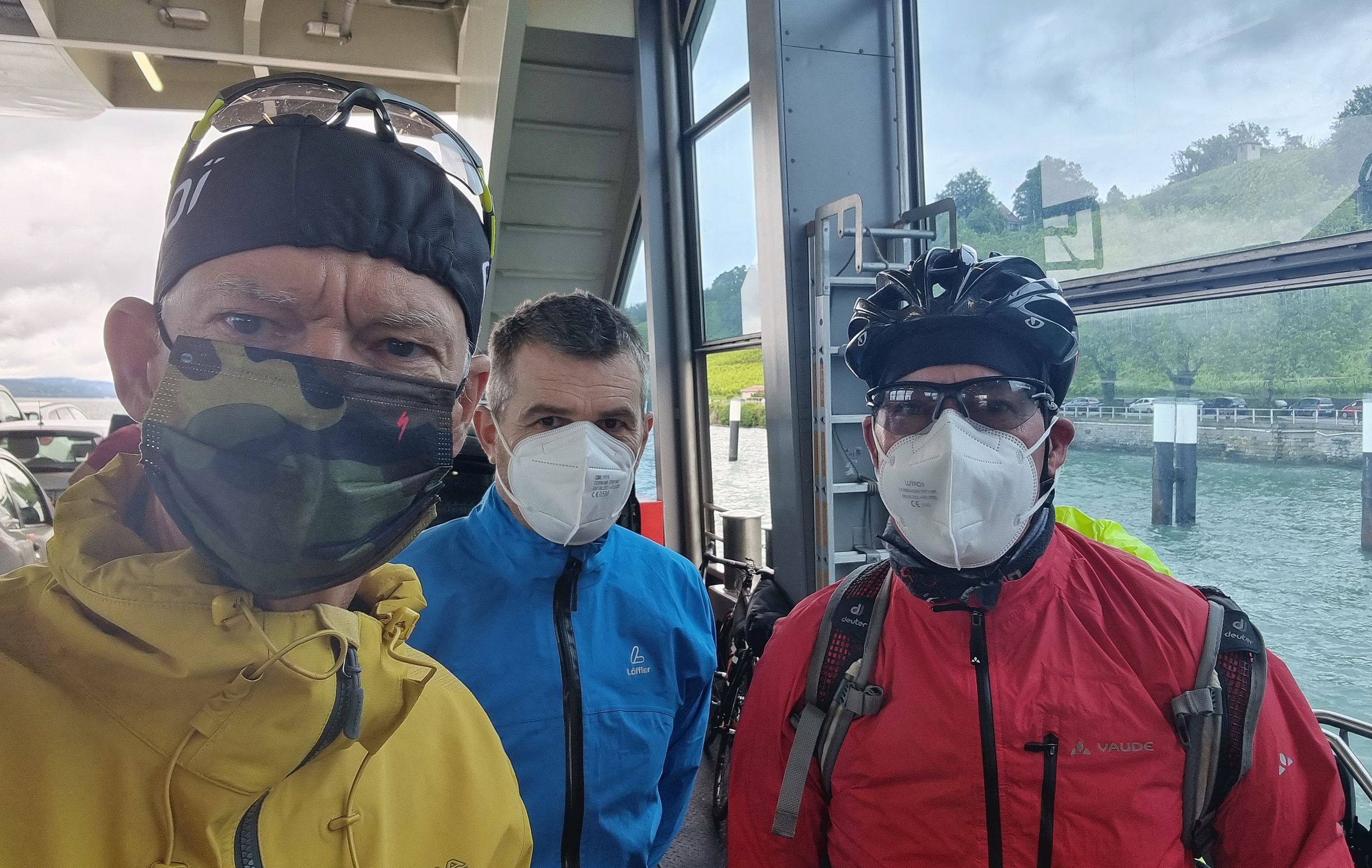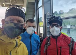 Der für Dienstag angekündigte Wetterwechsel trat leider auch genau so ein. Es regnet morgens in Strömen. dazu kam ein kalter Wind. Laut Wetter-App wussten wir, dass es gegen Nachmittag in unserem Ziel Tiengen trocken werden sollte. Nach kurzer Diskussion eröffneten uns Bernes und Rene, sie würden mit dem Zug zum Tagesziel fahren. Heinz-Werner, Pedro und ich entschieden uns für den Trip mit dem Rad. Zuerst zogen die Bahnfahrer zur Fähre los. Wir mussten ja den See zum zweiten Mal überqueren, um unseren Weg fortzusetzen.