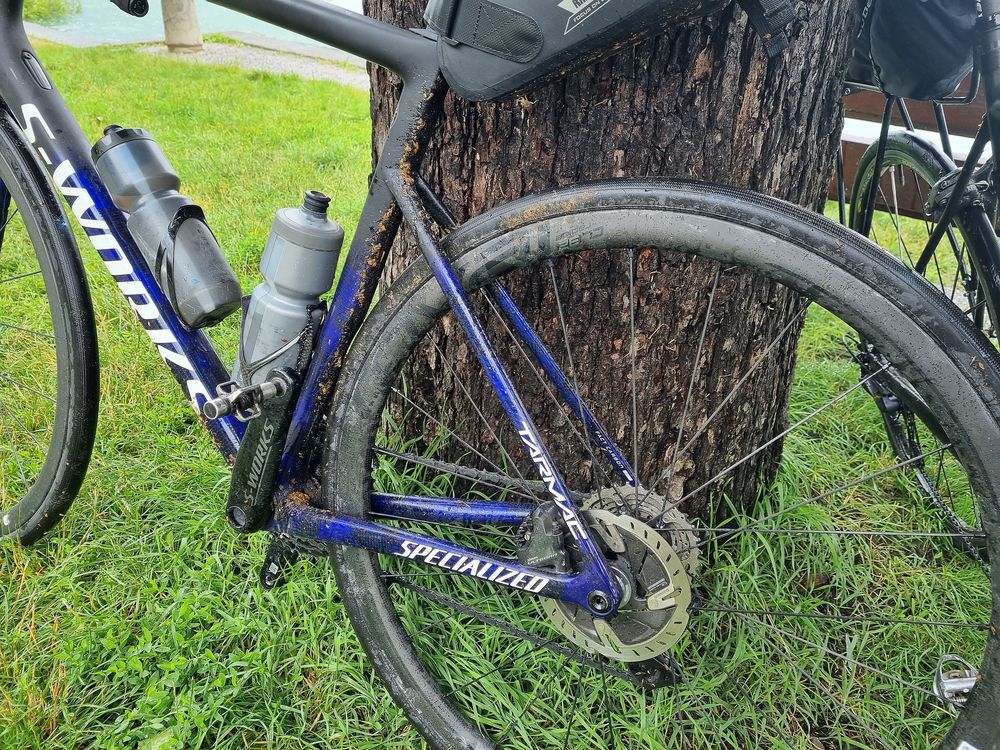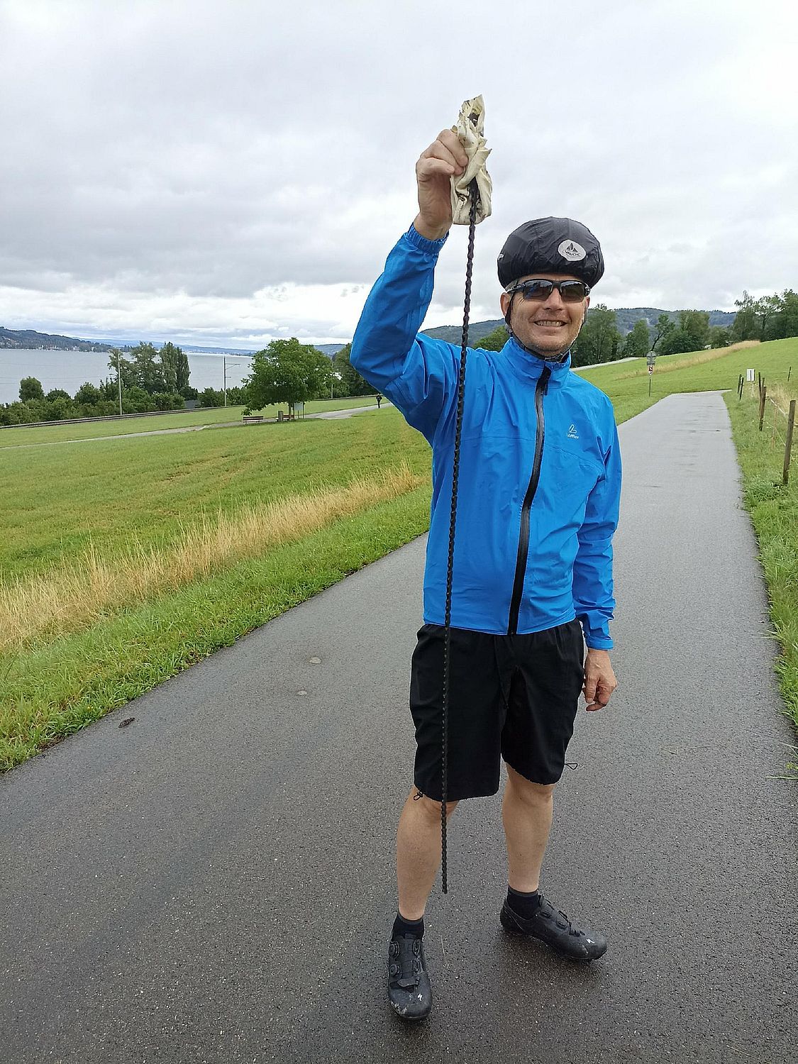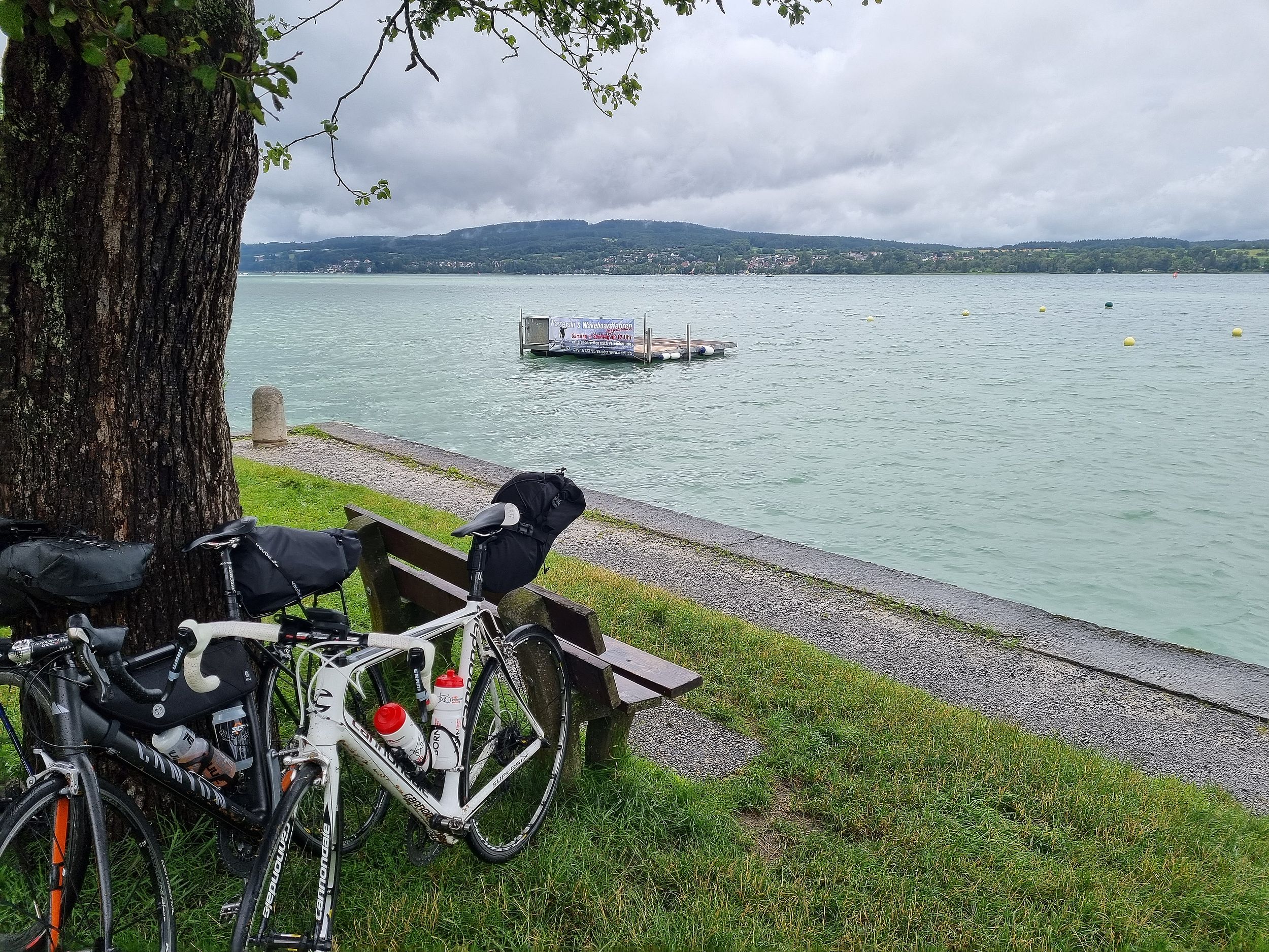 Zeitversetzt folgten dann wir Richtung Fähre. Schon auf dem Radweg am See wurde klar, es wird kein leichter Tag für Material und Piloten. Die nassen Überreste von Blütenblättern setzen sich überall an den Rennern fest.