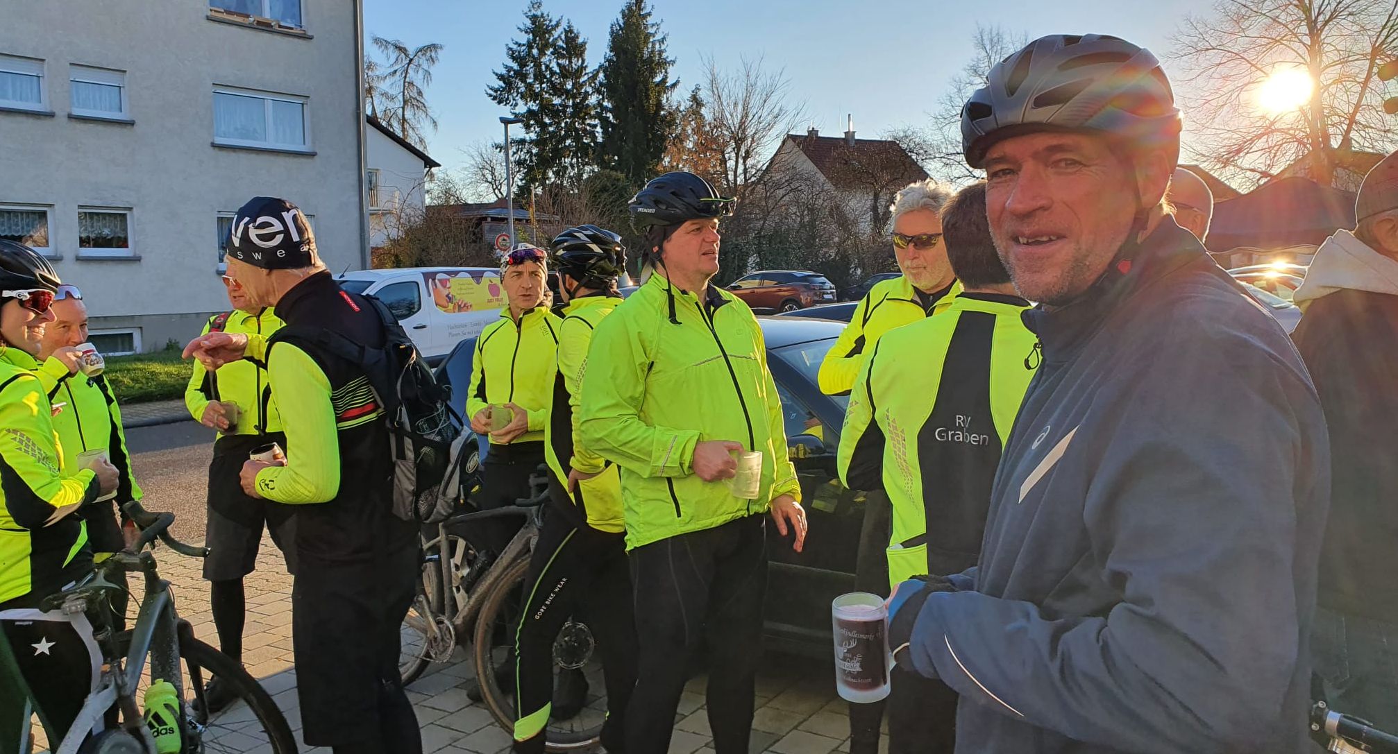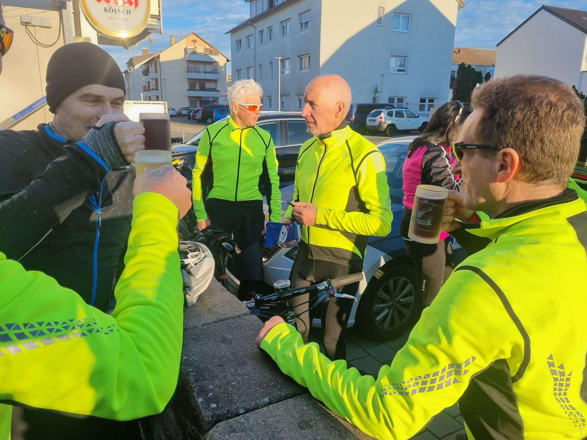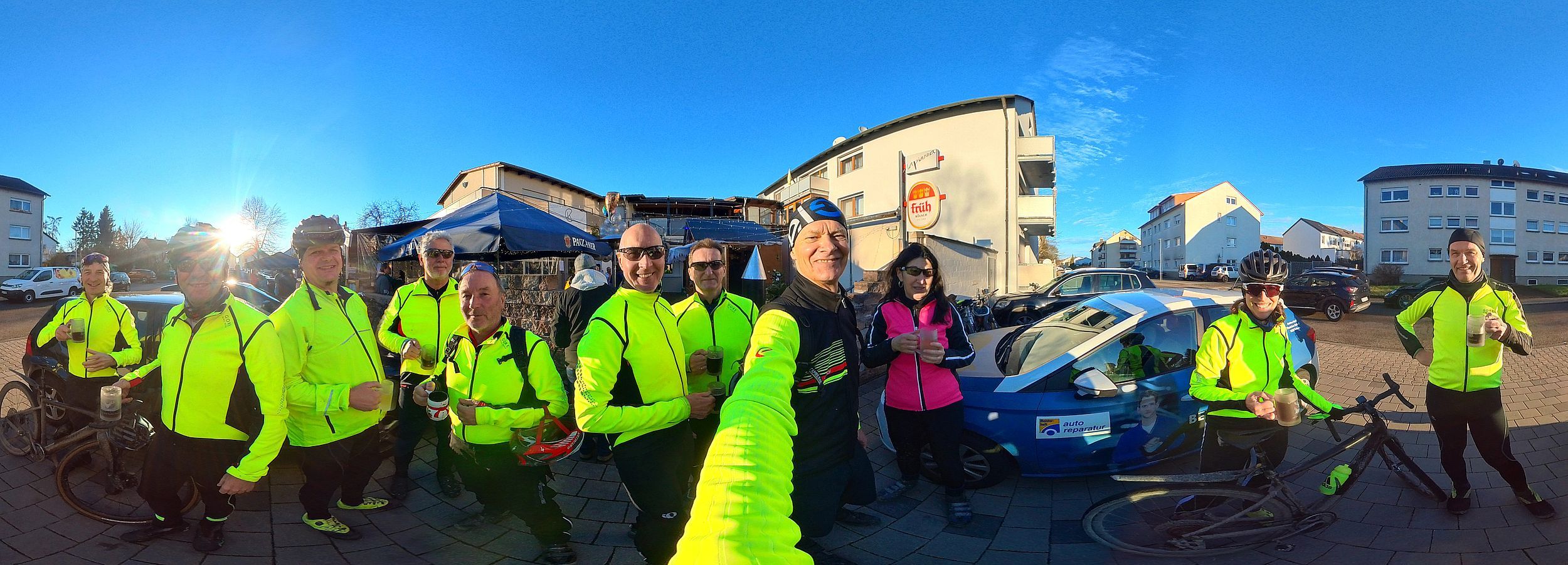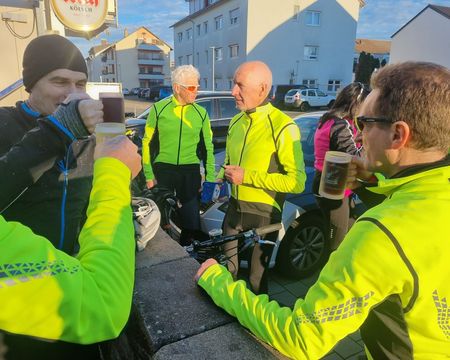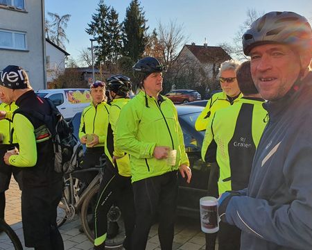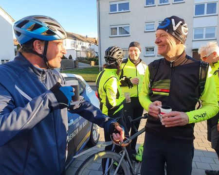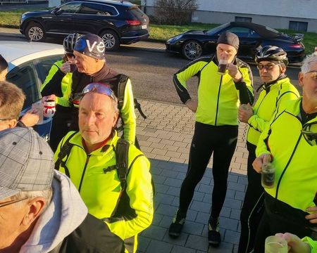 Bei frühlingshaftem Wetter war die Teilnehmerzahl unserer traditionellen Ausfahrt so groß wie nie. Mit erfreulicherweise 2 Mädels und 13 Jungs sind wir auf die Rheinrunde gegangen. Pedros Platten hat uns eine kleine Pause verschafft. Der Abschluss war bei Giovanni im Hof der "La Piazza". Es war für uns sehr schön, mal (fast) alle wieder bei dieser Ausfahrt zu sehen.