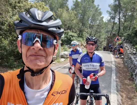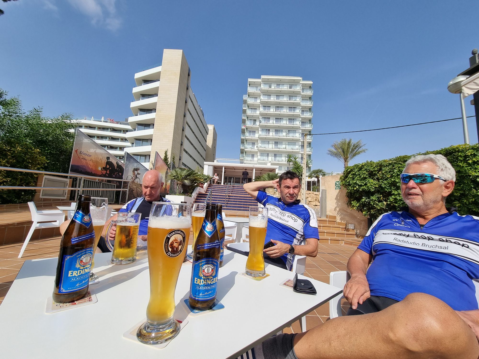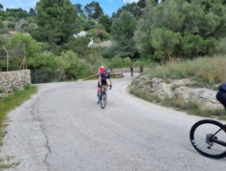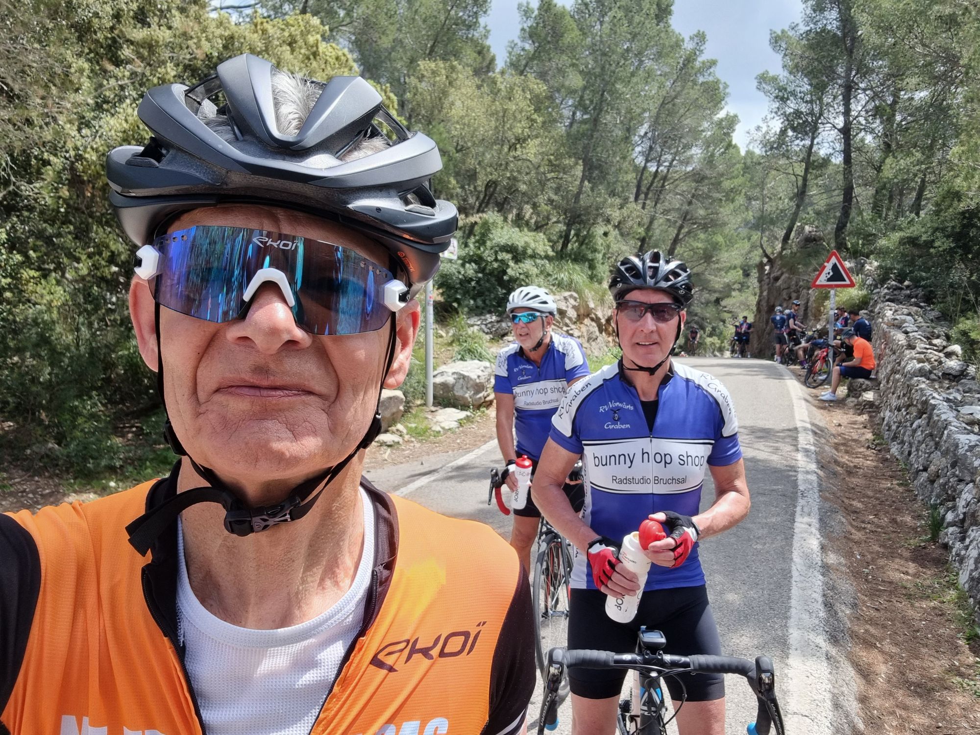 Dann ging es aus Palma raus Richtung Col de sa Creu. Hier kurbelte jeder sein Tempo und oben trafen wir uns. Auch dort waren mehr Sportler unterwegs, als üblich. Nach zwei Jahren Pause wollte jeder auf der Insel radeln. Über Calvia ging es dann nach Escapdelia. Dort wurden wir von Polizisten abrupt gestoppt. Wir waren an der abgesperrten Strecke des Radrennens Mallorca 312, bei dem fast die komplette Insel umrundet wird. Die Streckenführung war von Andratx in unsere Richtung. Da die Strecke gesperrt war, konnten wir unseren ursprünglichen Plan beerdigen. Nach kurzer Beratung beschlossen wir, das Beste daraus zu machen und in der Richtung des Rennens mitzufahren. In Galilea wollten wir dann ausscheren und unsere Mittagspause machen. Thomas war nicht mehr dabei. Nachdem ihn einer schnell überholt hatte, verlor er die Nerven und fuhr bis Alaro im Rennen mit.